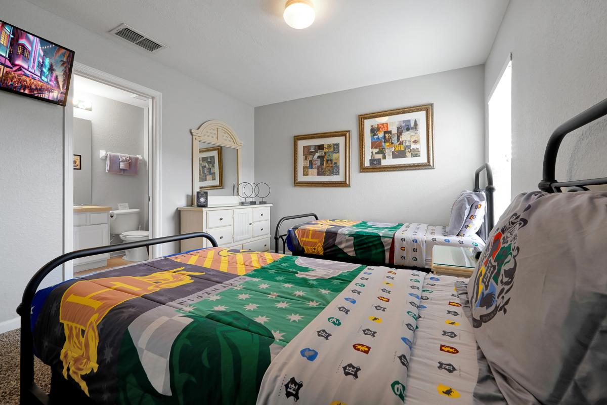 Five bedrooms -- each with its own bathroom for maximum privacy and comfort. No fighting over bathrooms! Two of the bedrooms are elegant master king suites with ensuite shower rooms on the lower floor. A third queen-sized master, also on the lower floor, has an adjacent bathroom with tub/shower. The other two bedrooms, on the upper floor, one with twin beds and a Harry Potter theme and the other with a King bed. Each bedroom has its own flat panel TV with cable.