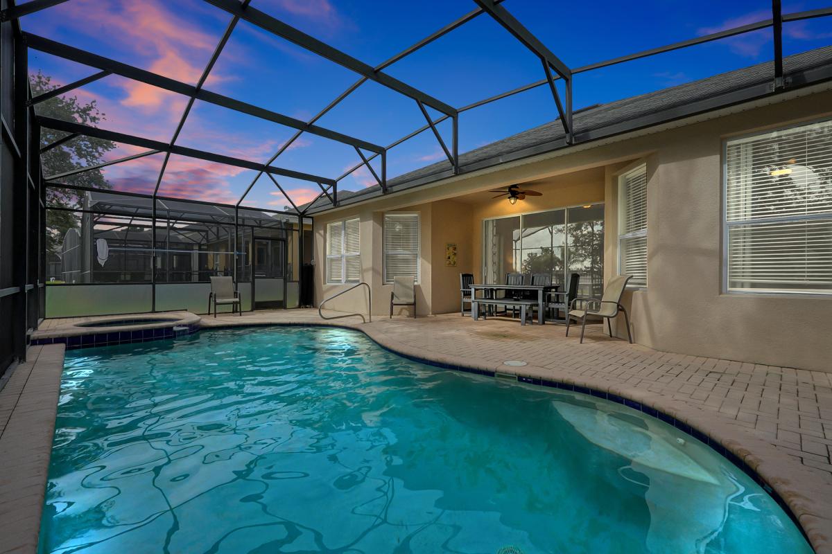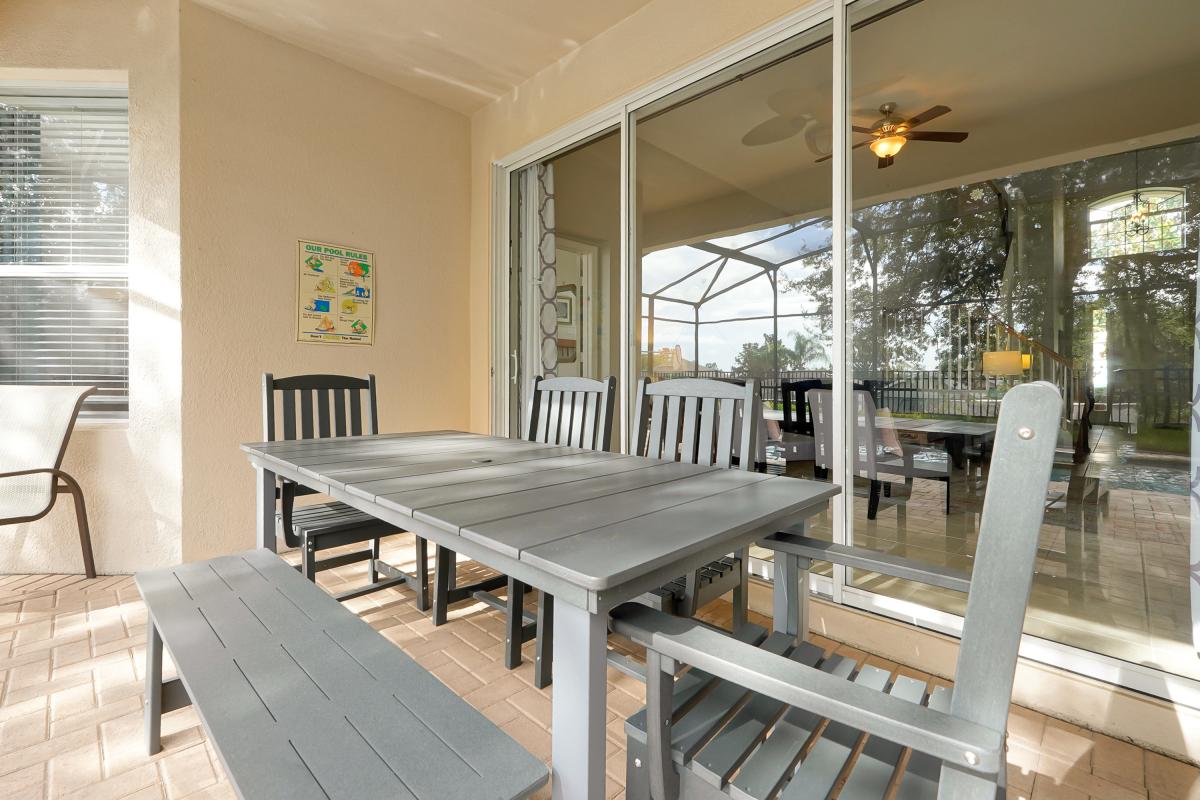 Our five bedroom, five bath villa features a private pool and raised spa with waterfall on an enclosed lanai for complete relaxation after a long day at the parks. New safety fence and pool door alarm to ensure safe, family fun. East facing pool and spa is not overlooked from the back with privacy panels on sides grants extra privacy, pool and spa heat is complimentary!