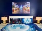 The Princess Room will delight royalty of all ages. It features a queen-sized bed beneath a wall-mounted crown cornice with sparkly sheers draping along the wall over the headboard of the bed. A crystal chandelier and white furnishings with crystal pulls complete the room. Both the Princess Room and the master bedroom have views of the Disney fireworks show shot from over the castle each evening. There is a stand fan provided in this room since this room has a chandelier instead of a ceiling fan.