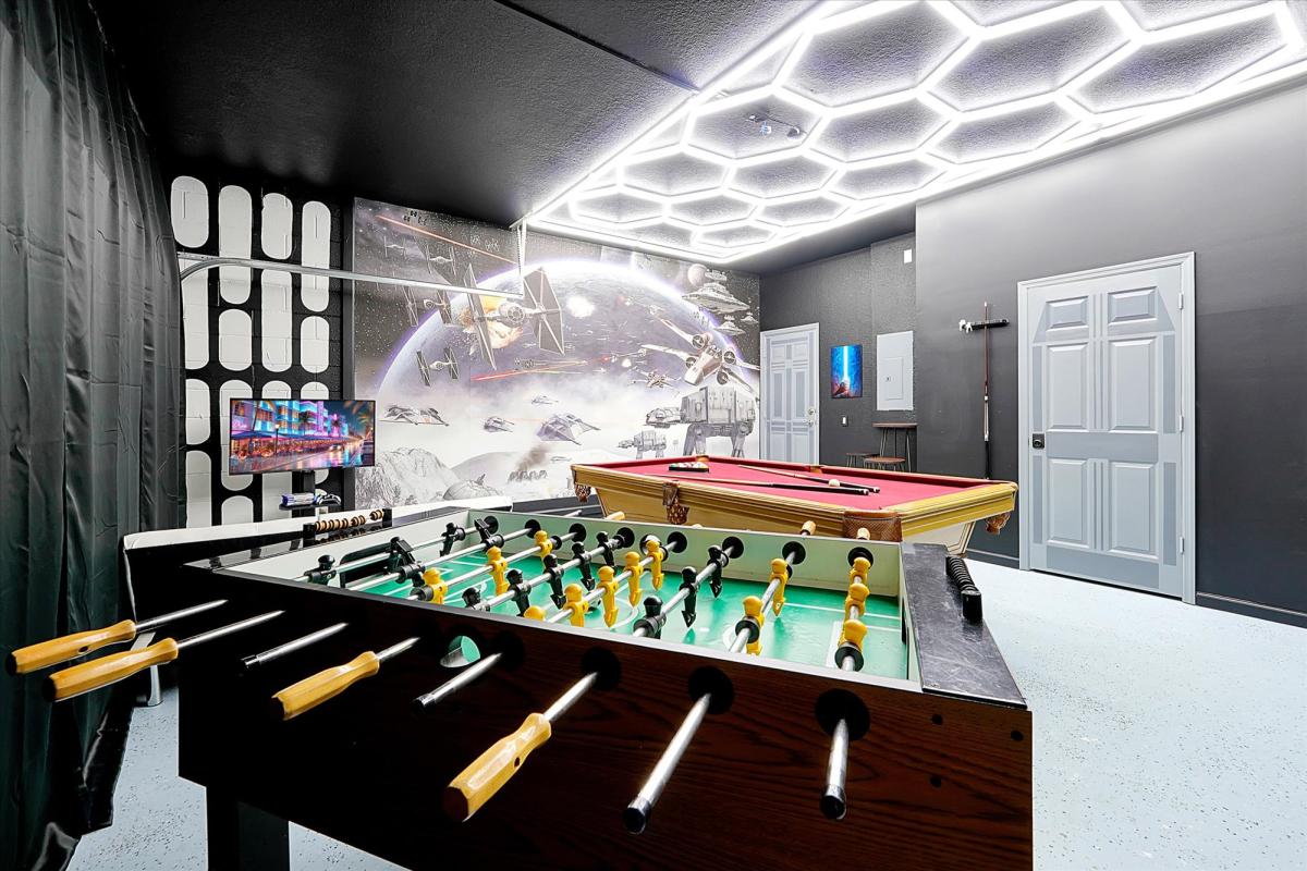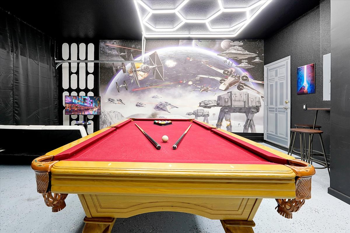 The large 6 bedroom 4 bath home as been recently been brought back to life with an updated style! Including new stainless steel appliances in the kitchen, new washer and dryer, a/c Star Wars Game Room with a pool table, foosball and PS5 with games, themed bedrooms for both the Fairies and Wizards. Comfortable new beds for all for the best night rest. Fully stocked kitchen for your home cooked meals or just a quick dine in evening. Newly resurfaced private salt water pool with free heat! Plus a grill to use on the private lanai, free of charge as well.