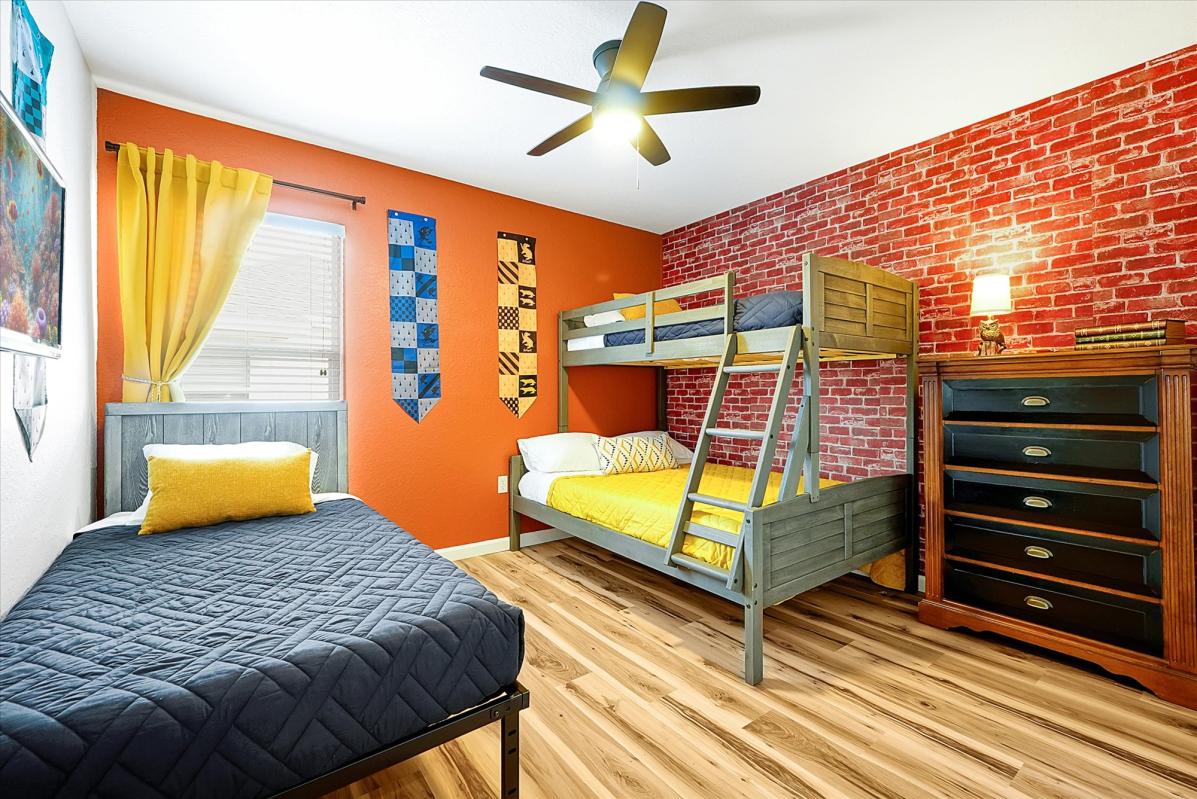 * Harry Potter themed room: twin over full bunk bed with an additional twin bed. TV with cable from fire stick