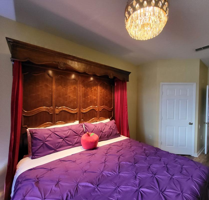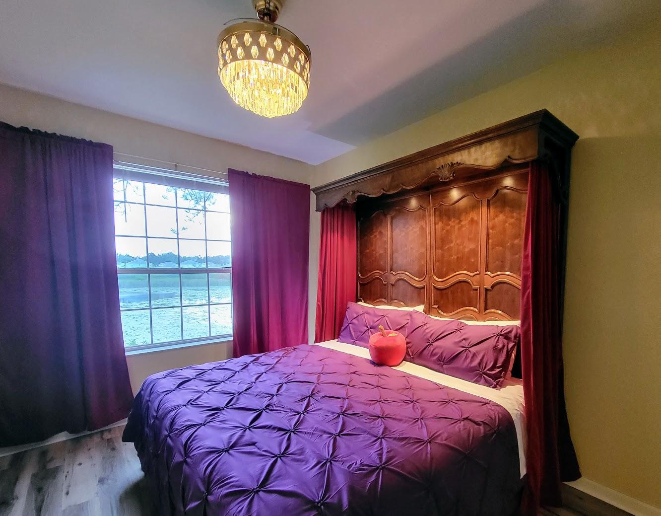 Our EVIL QUEEN'S ROYAL SUITE features a bed so grand, it's fit for a Queen! With it's soaring lighted canopy, adorned in royal purple (of course) and red velvet, the luxury you'll experience is beyond compare. The king sized bed is a sanctuary reserved for our most regal guests. Of course, The QUEEN'S THRONE ROOM is ensuite,, where you'll find gleaming, gilded appointments suitable for royalty. Why be a princess when you can be a Queen?