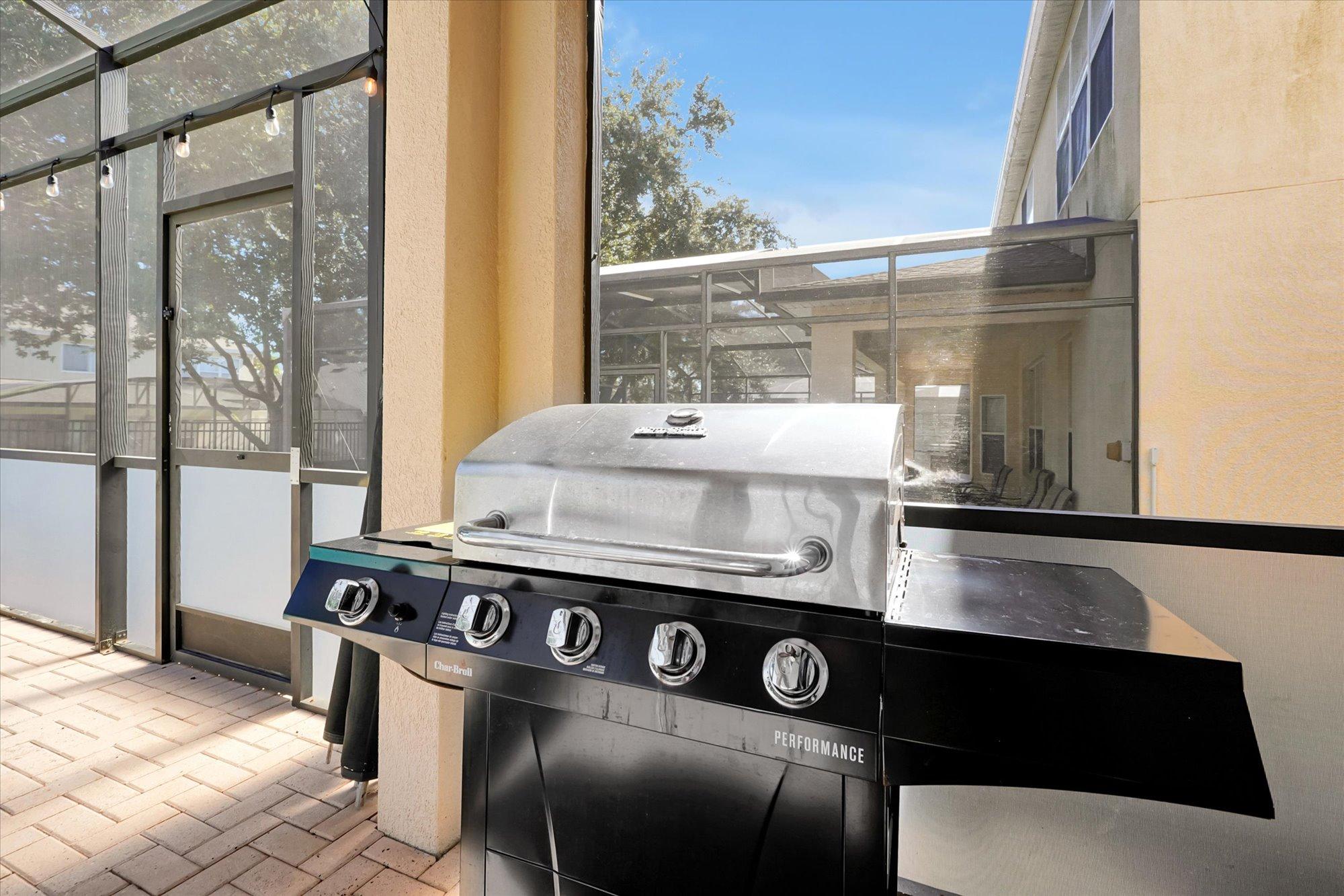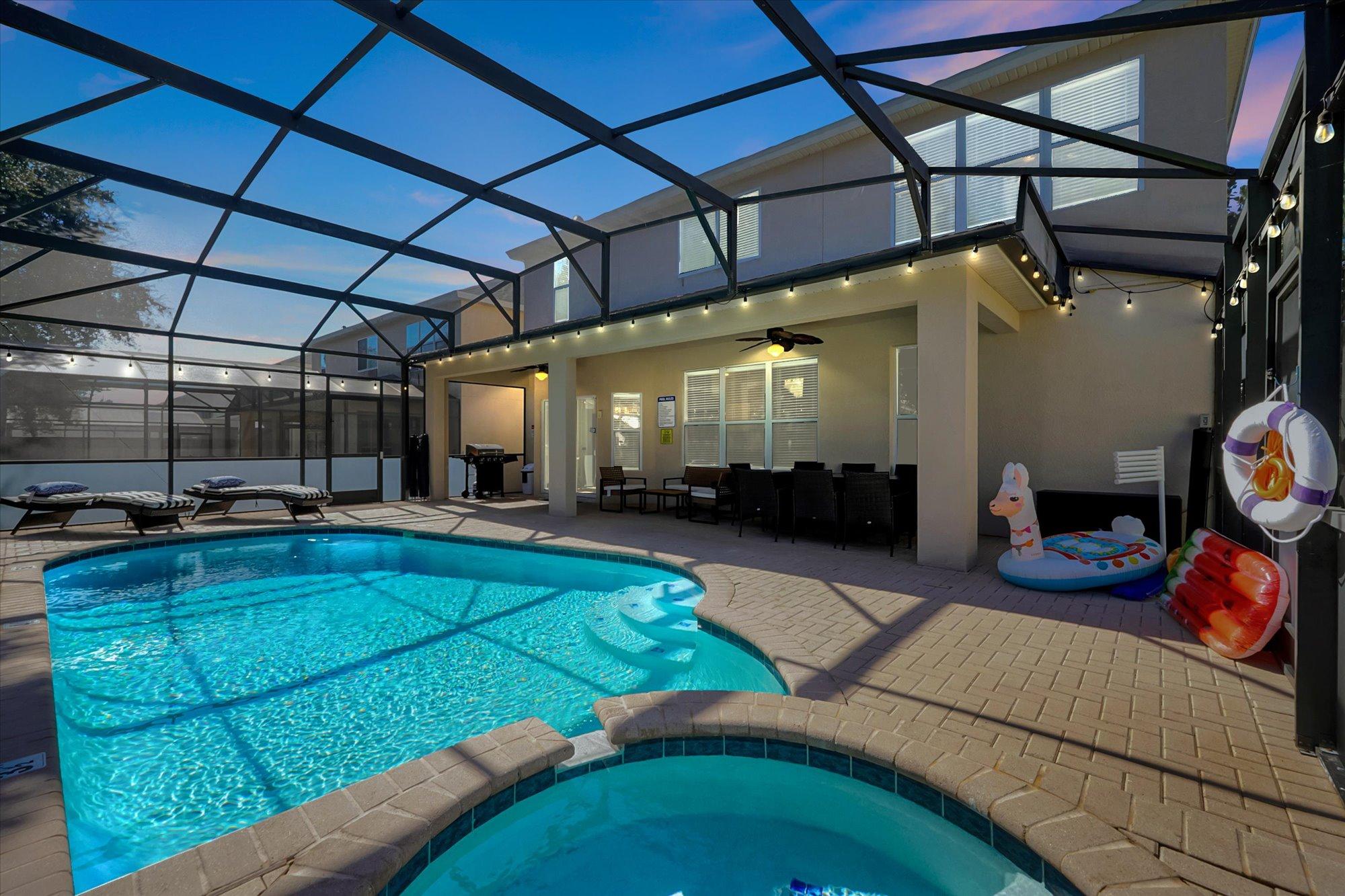 Step outside to your private pool and spa area, featuring a propane BBQ grill for delicious outdoor meals. Dine by the pool, unwind under the stars, and make the most of sunny Florida days.