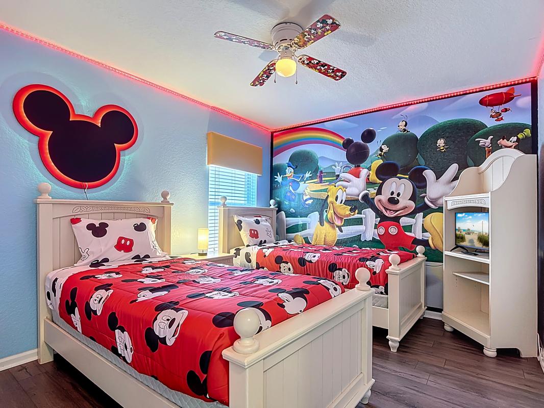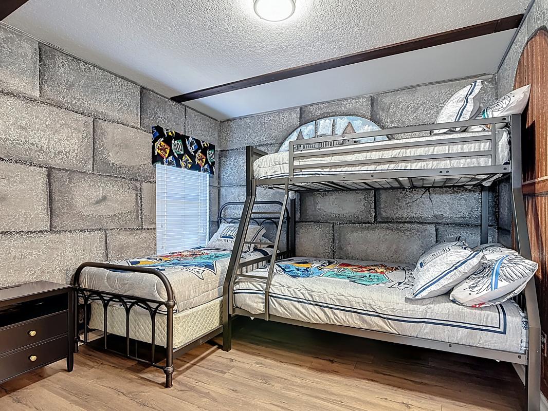 Kids Suite, Twin bunk beds, pull-out mattress, sleeper couch, Roku smart TV, and private en suite bathroom