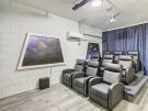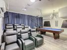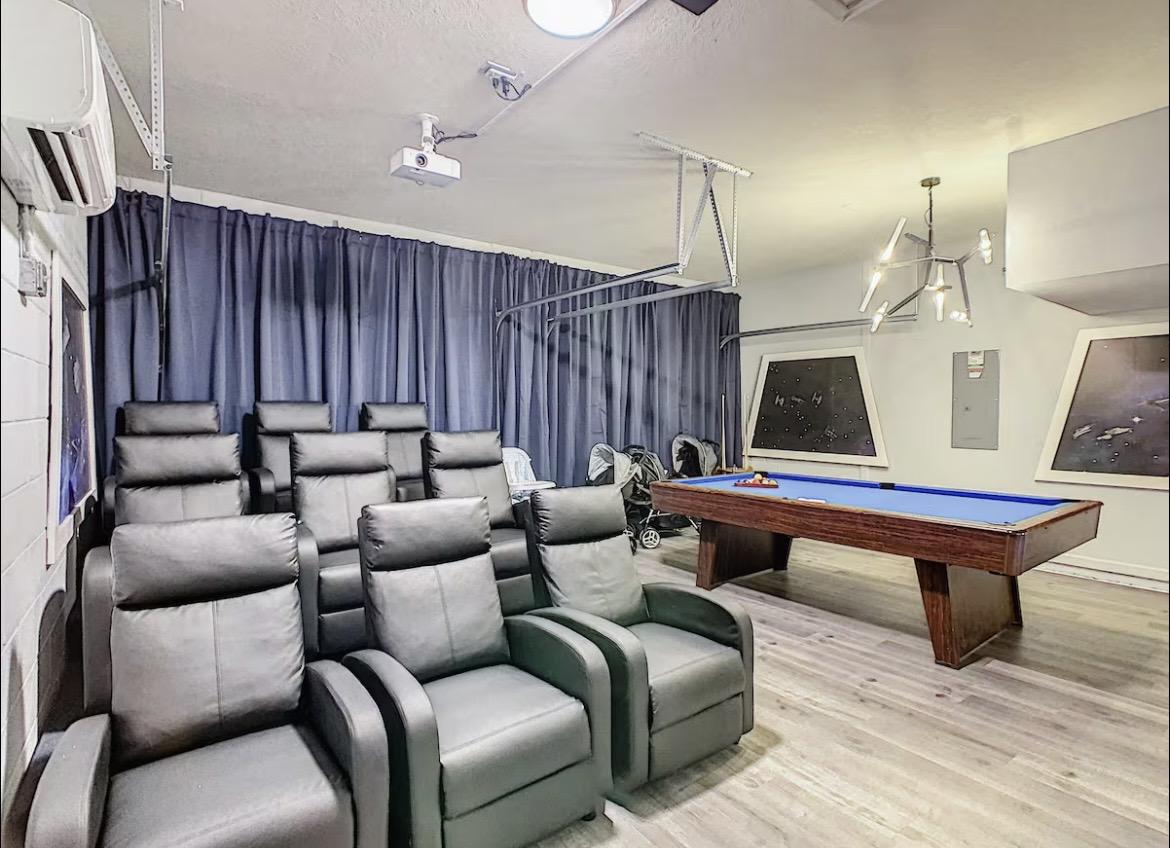 The garage game room includes a pool table and a 125-inch drop down projection screen, surround sound, and comfortable seating for 9 with air conditioning.