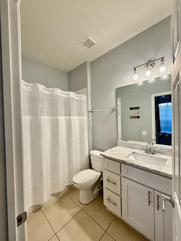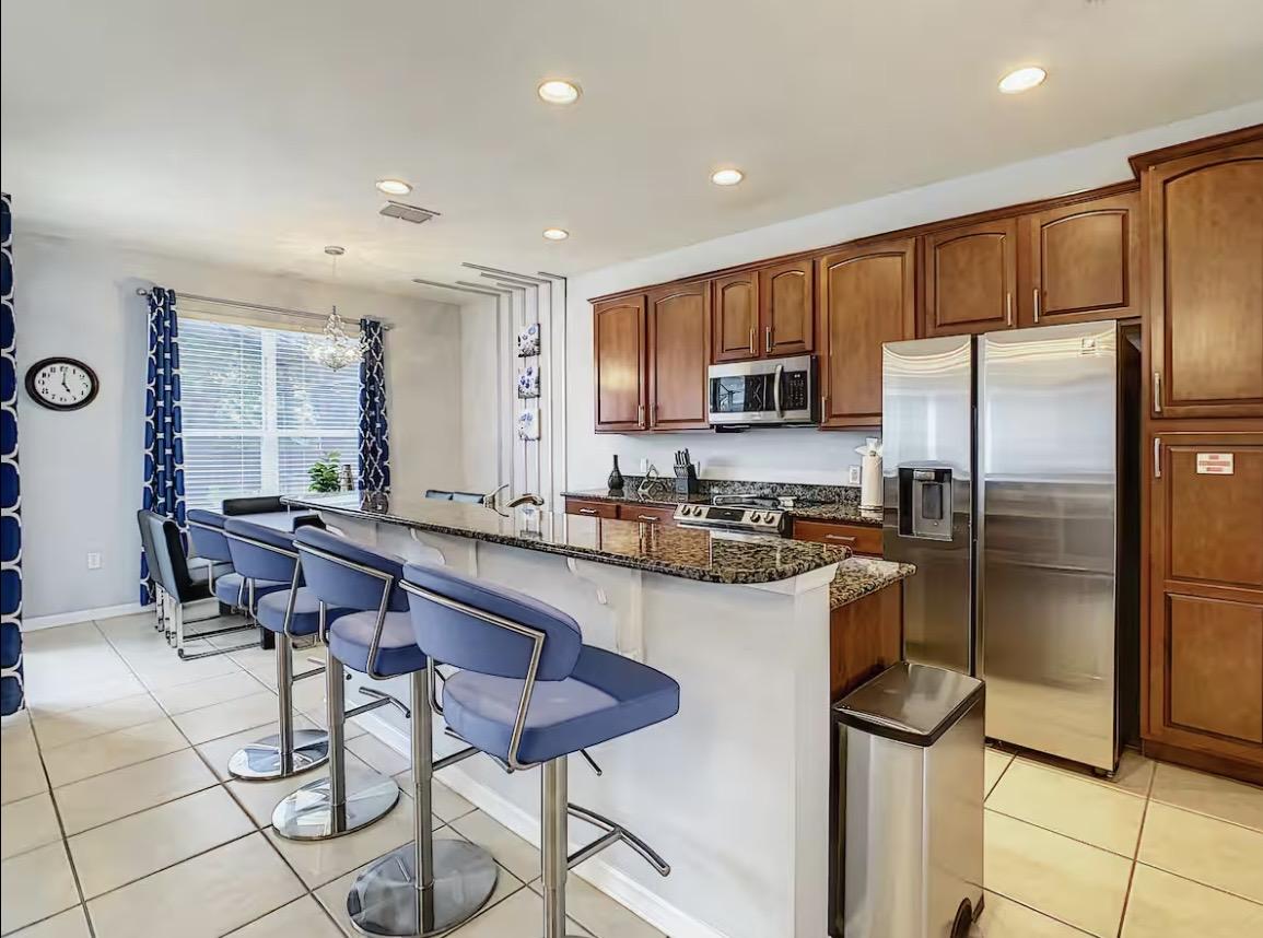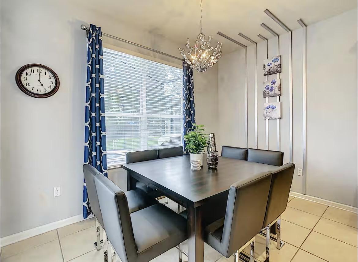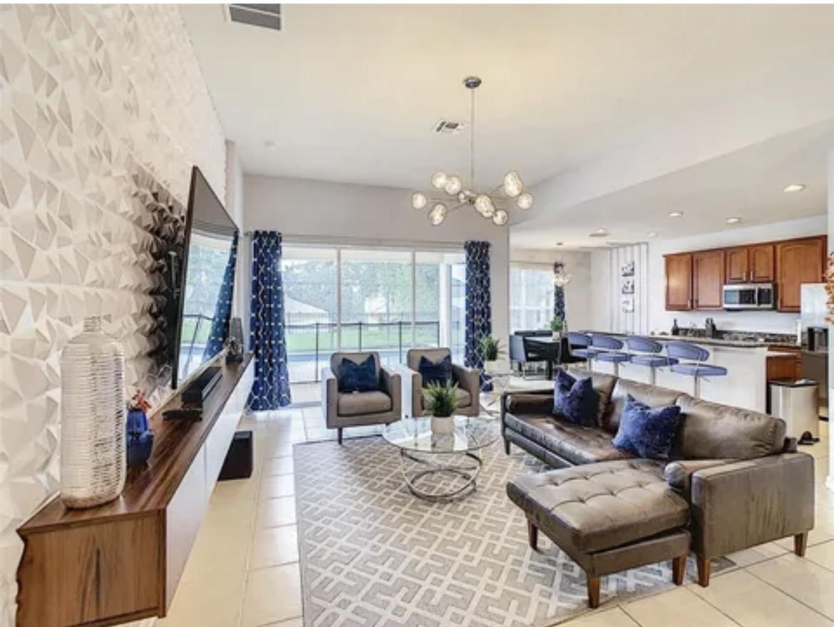 Pull into your very own private driveway upon arrival and walk through the front door into your home away from home. Step inside an open-concept living space filled with natural light, elegant finishes, and thoughtful design?perfect for gathering after long park days or enjoying relaxing resort-style downtime. The open concept living room is centered around an 82" 4K smart TV with a PS5 for all your entertainment needs. An air hockey table is right next to the space so you can play a quick game while waiting for everyone to get ready or while waiting for food to cook in the kitchen. The kitchen is well-equipped with everything you need to prepare a delicious meal or grab a quick bite to eat before heading out the door. Dining table has seating for 8 and counter seating for 4.
